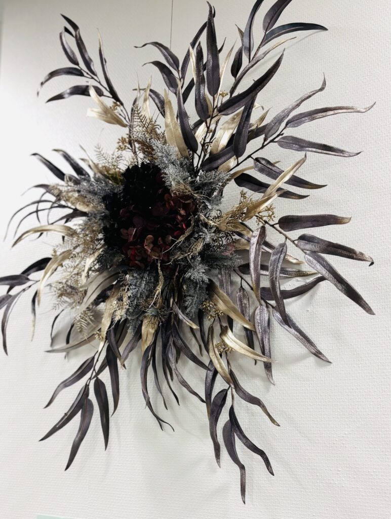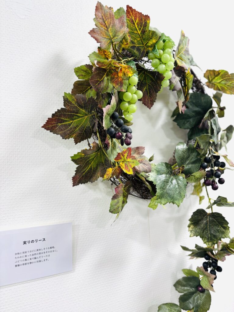 月替わりで作品展示が楽しめる横浜銀行港北ニュータウン南支店の9月の展示は、秋を感じるアーティフィシャルフラワーのリースをお届けします。