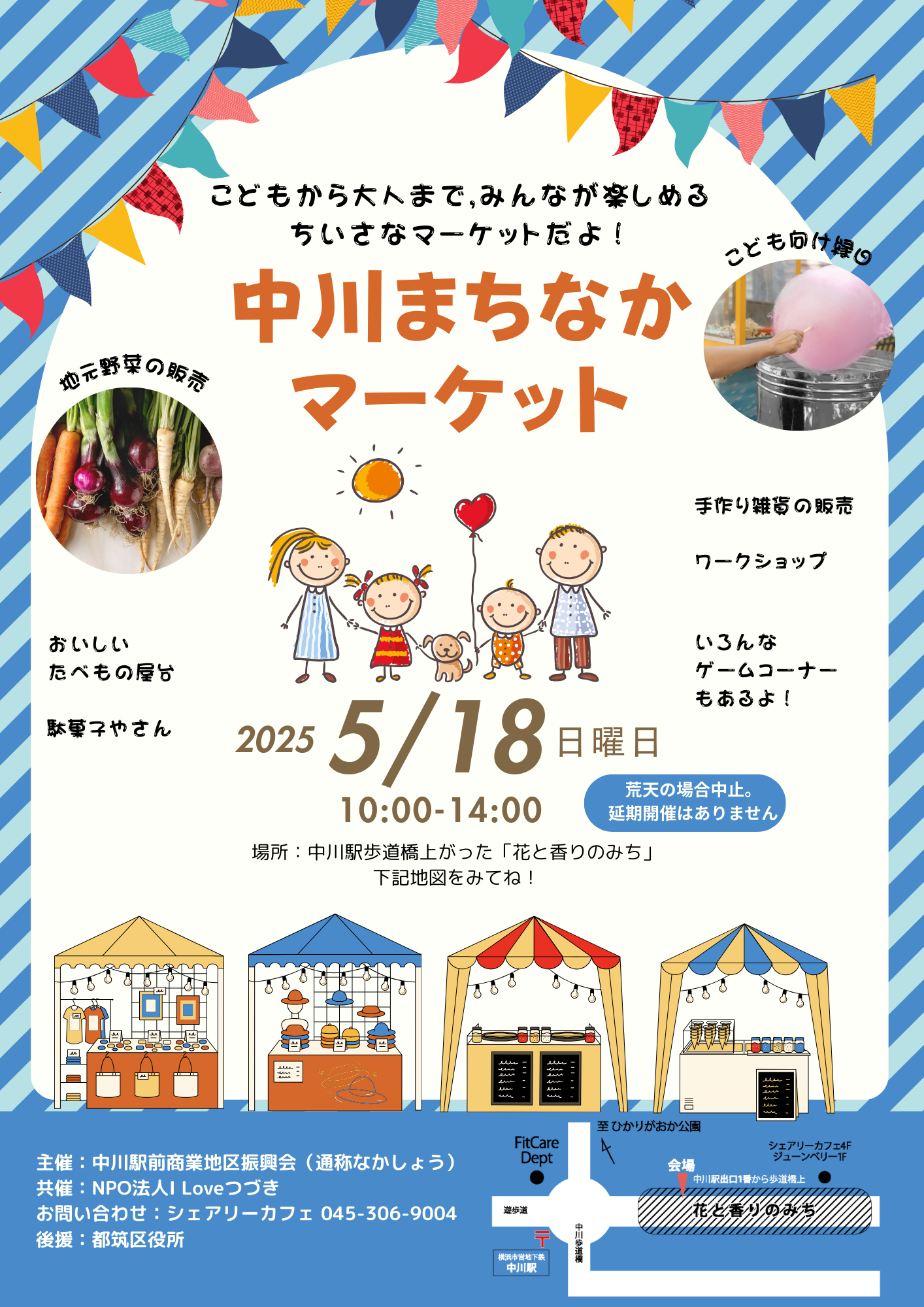 5月18日10時〜14時、中川駅、一段上がったところの「花と香りのみち」で中川まちなかマーケットを行います。
