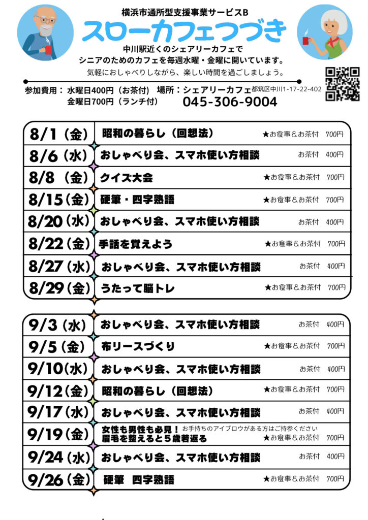 ひとりで家にこもらず、ちょっと外へ出てみませんか?おしゃべりを楽しみながら、スマホ講座や健康・おしゃれ講座など、参加がうれしくなるような時間をご用意しています。ここで友人ができたという声もたくさん!見学も大歓迎。涼しいカフェで、心も体も元気に。ご来店 お待ちしています。